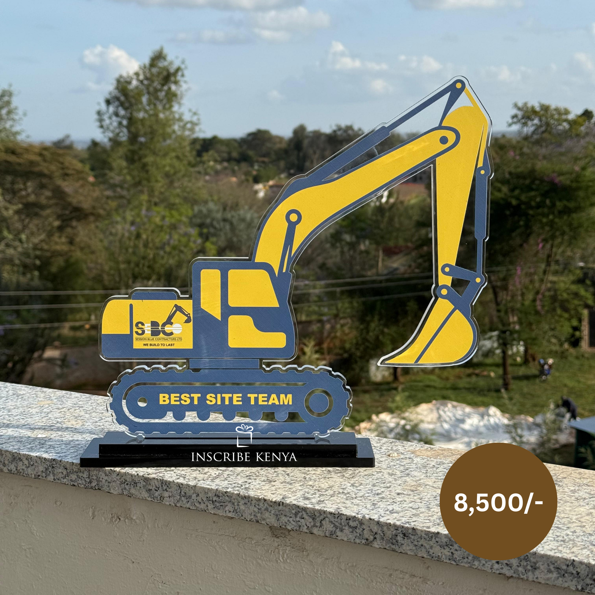 custom acrylic awards Kenya, engraved trophies Nairobi, construction themed awards, corporate recognition gifts Kenya, personalized awards Nairobi, custom trophies Kenya, excavator shaped trophy, engineering achievement award, Inscribed Gifts Kenya awards, premium acrylic trophies.