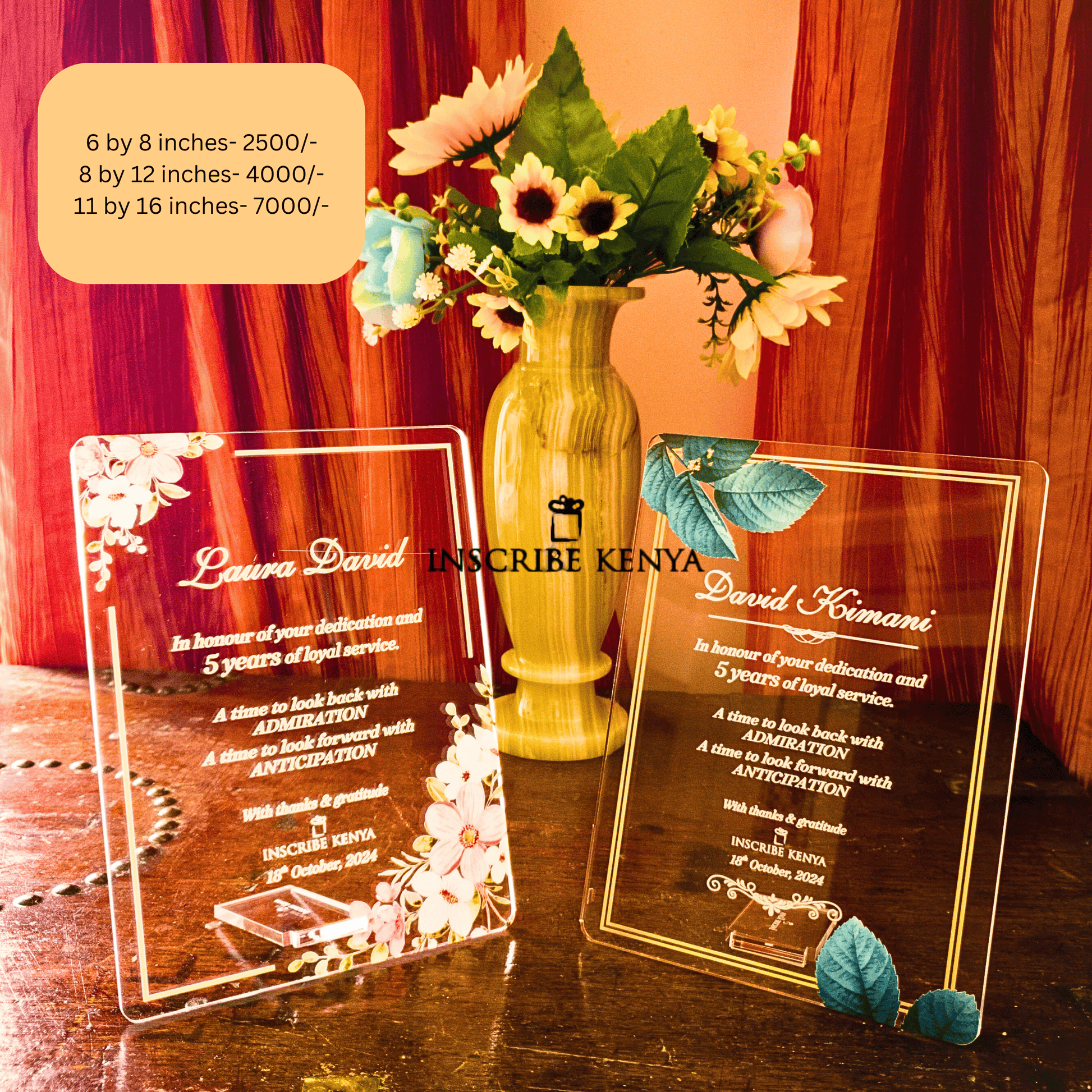 Keywords: Nairobi, Kenya, Inscribe Kenya, Floral Acrylic Plaque, Custom Plaque, Personalized Awards, Male and Female Plaques, Corporate Recognition, Achievement Awards, Elegant Plaques, Modern Design, Durable Acrylic
