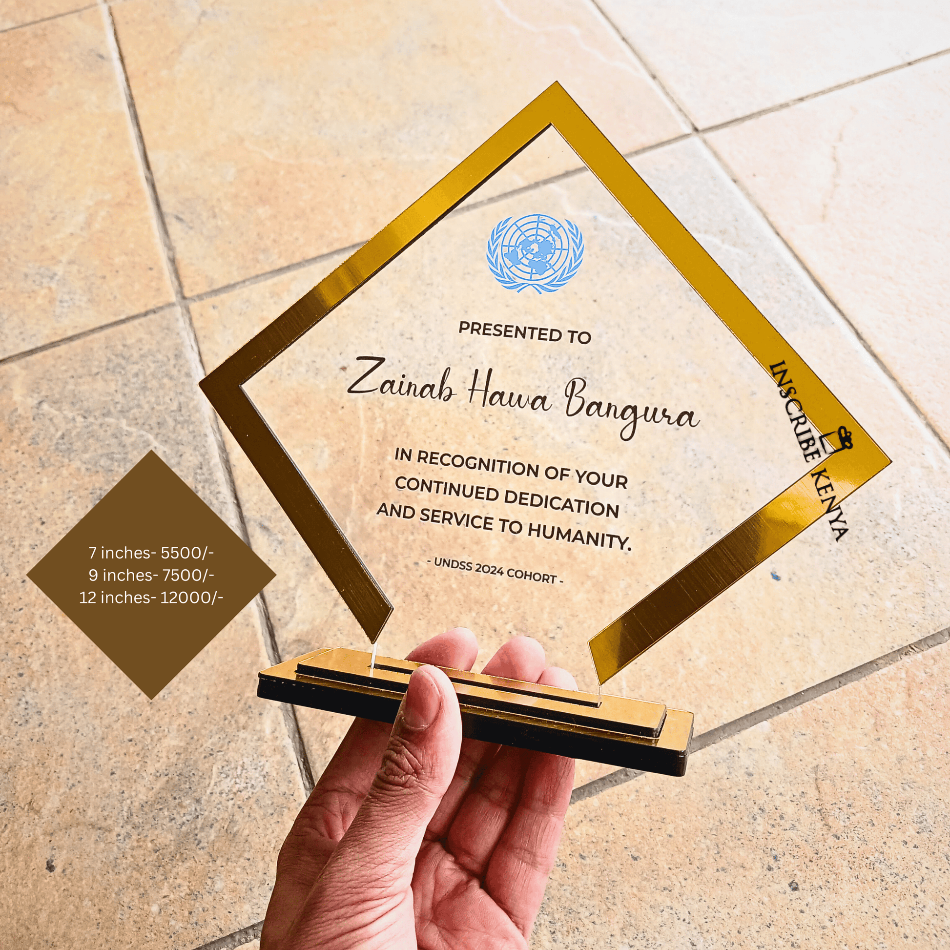 Whether it’s for corporate events, employee recognition, or special occasions, this versatile award provides an impressive canvas to honor top performers. Each Tilt Square Acrylic Award is carefully crafted in Nairobi, Kenya, ensuring the highest quality and durability. A timeless piece, it makes an eye-catching addition to any office, desk, or display shelf, capturing achievements with a touch of distinction.